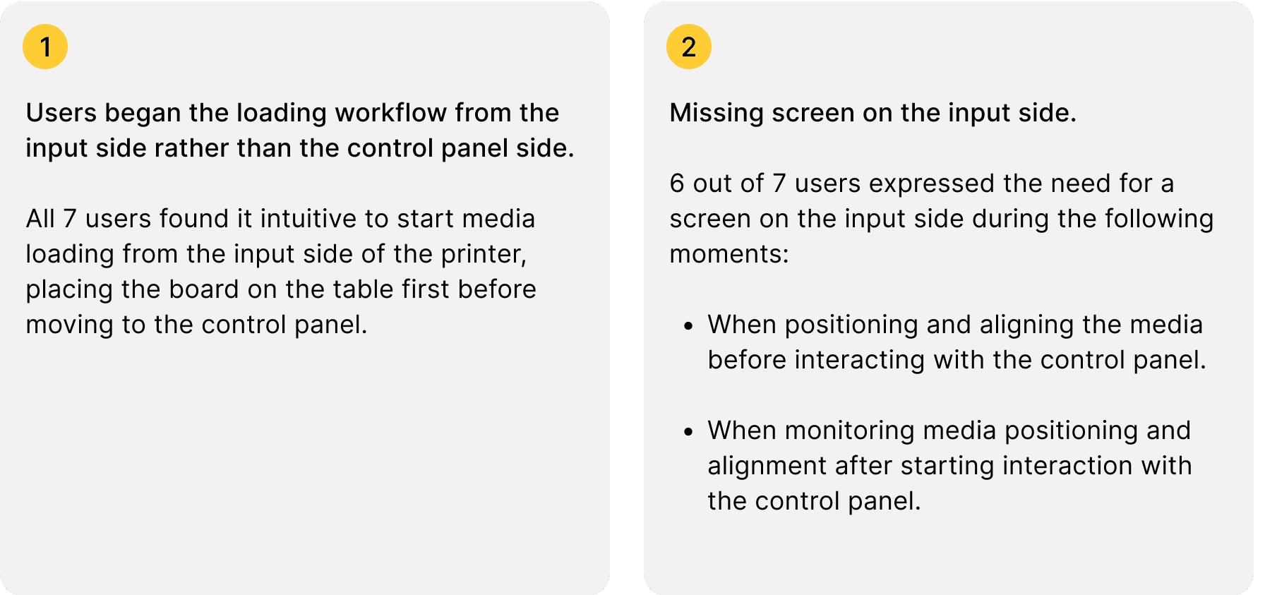 The first thing we did was design the loading workflow from the control panel. In all previous products, the input and output were on the same side of the printer, so the user didn’t have to move back and forth to complete the loading process. In our case, we knew the user would have to move between sides several times during the process, but we wanted to see if, even with an imperfect experience, it could still be acceptable. We implemented the loading workflow from the control panel with the intention of testing the process and gathering valuable insights.
