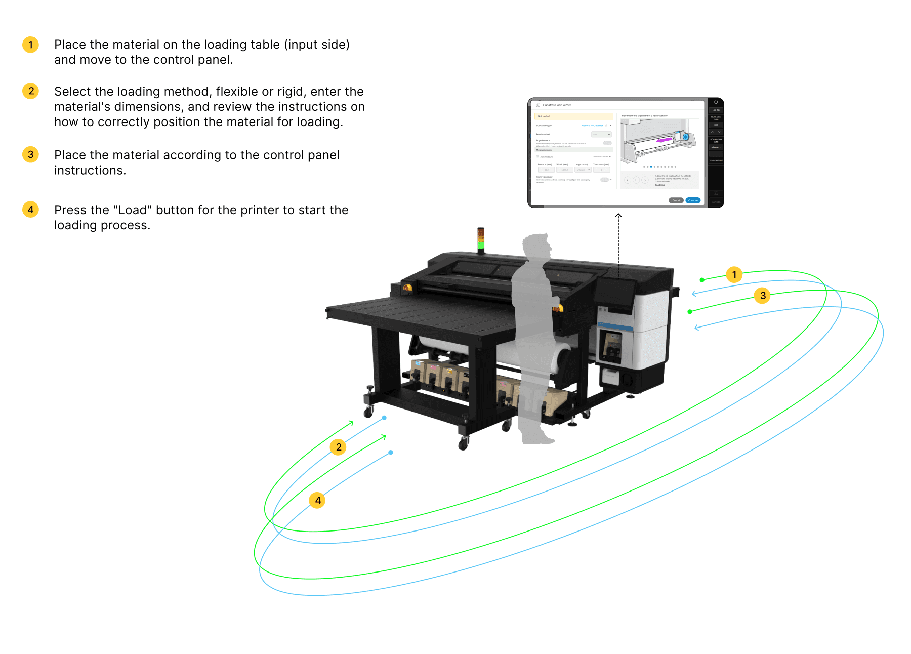 After gathering insights from the user test, we concluded that 90% of users found it unacceptable to have to move back and forth so many times to load the material. Many of them suggested adding a screen on the input side to handle material selection and size adjustments from there, thus reducing the need to move around. It’s important to note that spaces in this type of business tend to be small, limiting mobility.Our main limitation is that, due to production costs, it’s not feasible to include a second screen (Control Panel) on the printer. Therefore, the use case should focus on how to allow users to set the material type and size, and feed the material, without adding another screen.
